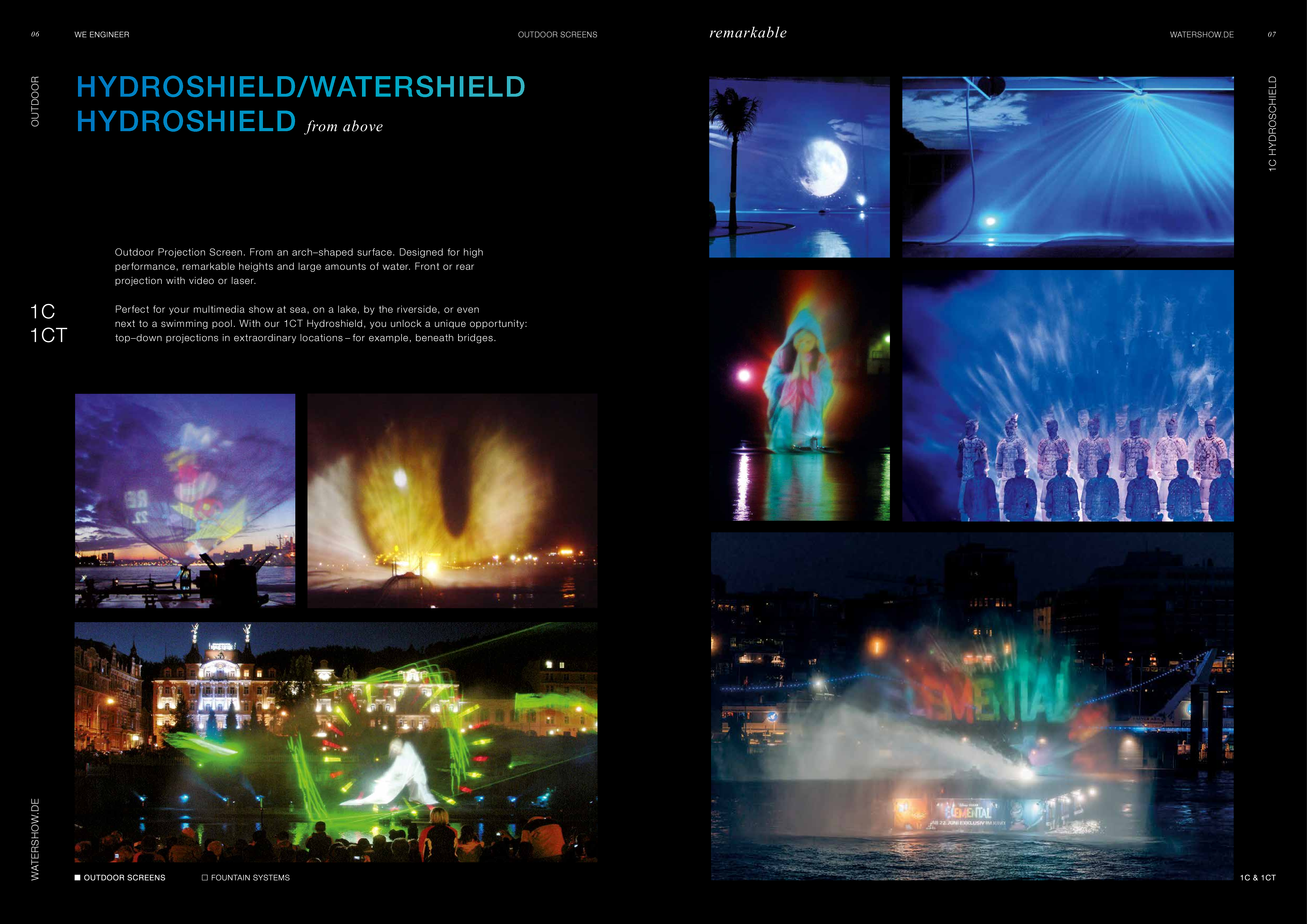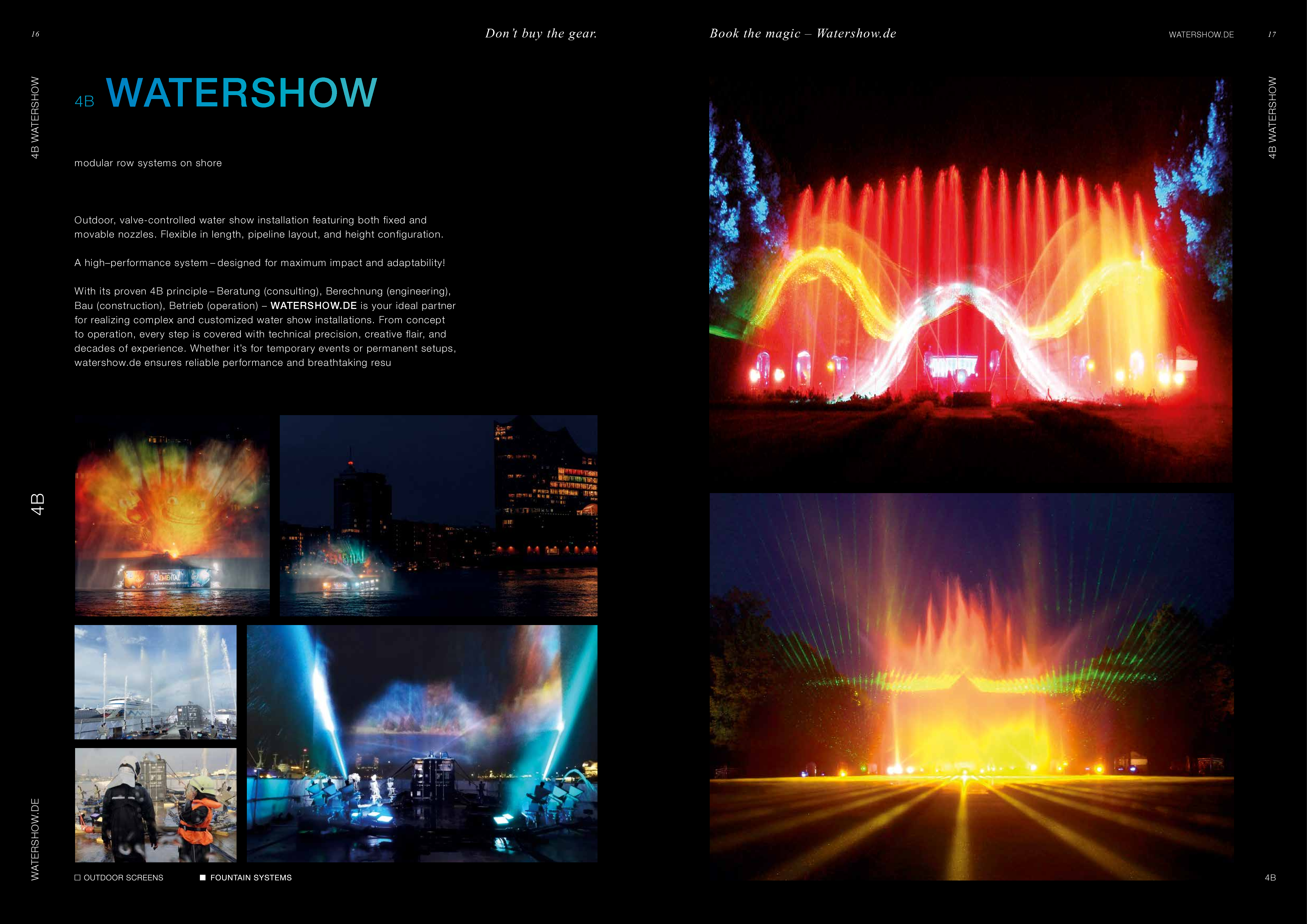 Watershow.de GmbH transforms water into unforgettable experiences. From dazzling fountains and elegant water walls to high-tech waterscreens that write logos and images with falling drops — every show is a one-of-a-kind highlight. With custom solutions, flawless engineering, and stunning visual impact, Watershow.de makes brands shine and events unforgettable.
